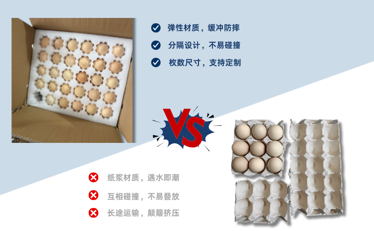 这就好比给每个鸡蛋都配了一个独立的“安全气囊”。无论快递途中如何颠簸、堆放,珍珠棉的弹性材质能做到360度全方位护航 。尤其对于现在电商流行的10枚、30枚、50枚装的小规格,我们都有配套的内托,让鸡蛋在盒子里纹丝不动。